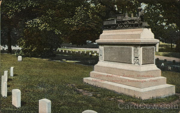 Front: Raiders. Monument. 13271 Andrews Raiders Monument, National Cemetery, Chattanooga, Tenn. Back: Souvenir Post Card Co., New York Post Carde to pe 1908 This space is for the Printed in Germany.