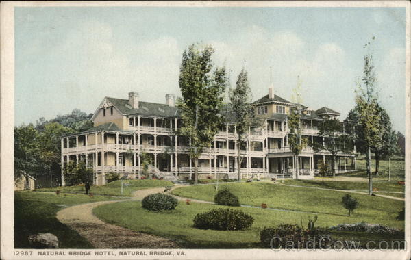 Front: 77 12987 NATURAL BRIDGE HOTEL, NATURAL BRIDGE, VA. 33.9 Back: MADE ONLY BY DETROIT PUBLISHING CO. "PHOSTINT" CARD. TRADE MARK REG. U. S. PAT. OFF. THIS SPACE MAY BE USED FOR MESSAGE. AND CANADA. FOREIGN. TWO CENTS
