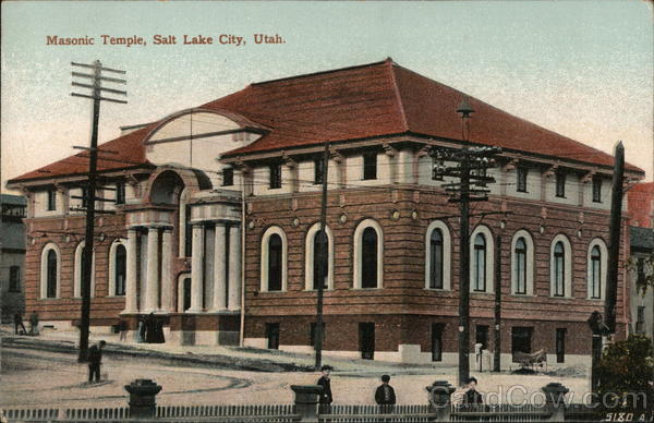 Front: Masonic Temple, Salt Lake City, Utah. է: ՈՐՈ ՈՐ ՈՈՐ 5IXD A. Back: TRAIN PANC QUALITY 200 200 No. U 3. Pacific Novelty Company, Publishers, San Francisco, Cal. Made in Gt. Britain. 1 c FOREIGN. 2 c