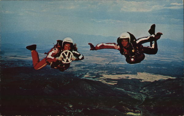 Smiling Jim & Gloria Porter, 1971 U.S. Team Training - Up in the air for 10th anniversary transportation support to U.S. Parachute Team. Our thanks to Volkswagen. The proceeds from the sale of this card are used for the support of the United States team. |