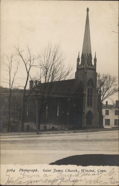 Front: 5064 Photograph. Saint James Church, Winsted, Conn. and mar lo. Hoke you enjoyed your vacation Back: NS EL POST CARD: 5-PM CON Miss Florence Laurence Inlip expertion Bristol Com ور