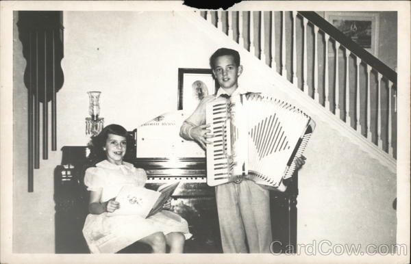 Little girl seated at a piano and a boy with an acordian.