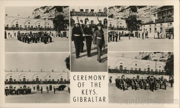 Front: CEREMONY OF THE KEYS. GIBRALTAR AP Back: Copyright "Rex" Tobacconist, 224. Main Street, Gibraltar. Real Photo. 3 Printed in England. Britain in Printed