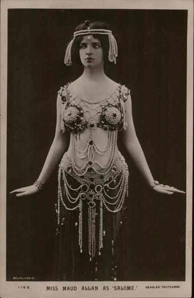 Front: PEUTLINGER. 118.B. MISS MAUD ALLAN AS 'SALOME.' BEAGLES' POSTCARDS. Back: (Printed in England). J. BEAGLES & Co., LTD., PRINTERS & PUBLISHERS, LONDON, E.C. FOR CORRESPONDENCE. BEAGLES' POST CARDS CARD. AFFIX HERE.