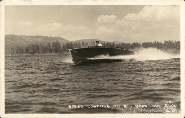 Front: STEP IN FOTOS SPEED BOATING ON BIG BEAR LAKE Frashers PORONA Back: PUBLISHED BY FRASHERS, INC., POMONA, CALIF.