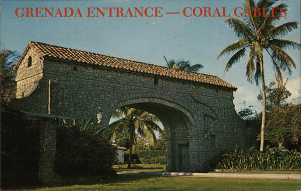 Front: GRENADA ENTRANCE-CORAL GABLES Back: CGM2 Colorful entrance to Grenada Boulevard in Coral Gables is constructed of native coral rock, with a Spanish architectural background. FS 37556