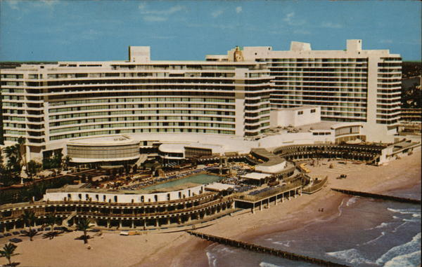 | Hotel, Cabana and yacht Club. America's finest and most complete resort featuring 1,000 luxuriously appointed guest rooms... 4 tennis courts, putting greens, golf at exclusive country club... 1,000 feet of beach, 300 cabanas, two swimming pools... "Holiday" Award cuisine. OCEANFRONT, 44th to 47th Streets Miami Beach, Florida |