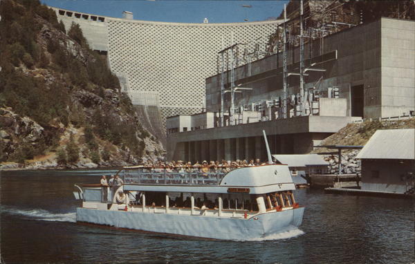 Tourists on City Light's 102-passenger tour boat Alice Ross II passing in front of Ross Dam and Powerhouse. In the background is 540-foot high Ross Dam, key structure of the Skagit Hydroelectrict Project and one of the highest dams in the nation. |