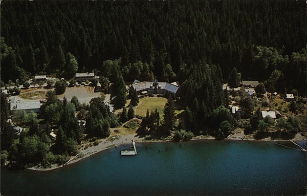QUINAULT, WASHINGTON This aerial view shows the famous Quinault Lodge in the center. C-106 Aerial color by Clifford B. Ellis 46821-B Pub. by Ellis Post Card Co., Arlington, Washington WEST MYACK, N. HERE