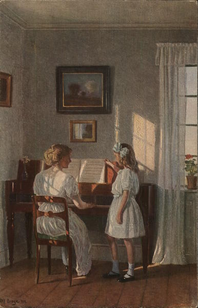 Front: Y Zးမရ ဒီ Back: No. 9658, copyright Arthur Schürer & Co., B.-Schöneberg. ASCO ,,Dänische Kunst". Alfred Broge pinx: Erster Unterricht. Den første Undervisning.