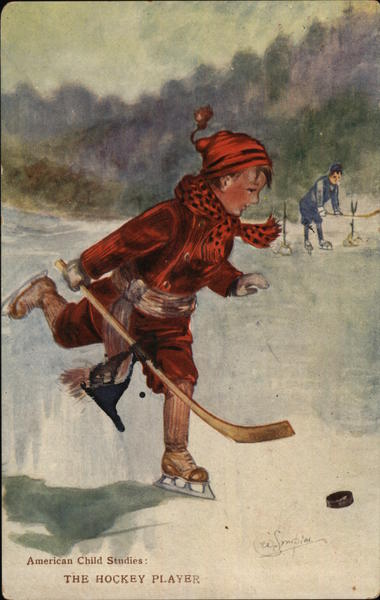 Front: American Child Studies: THE HOCKEY PLAYER respondine Back: Valentine & Sons' Publishing Co, Ltd. New York C.W. Simpsor, Centrit SOUVENIR POST GARD ...... .... 10.00 Valentine's "ARTOTYPE" Series, from Paintings by C. W. Simpson
