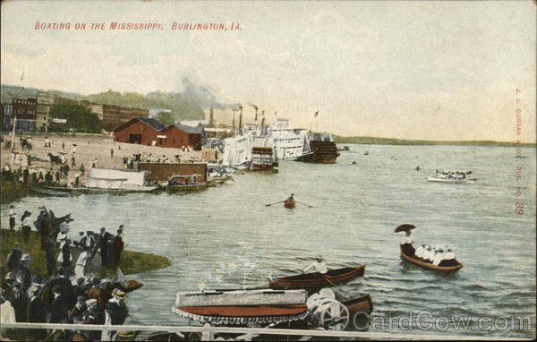Front: BOATING ON THE MISSISSIPPI, BURLINGTON, IA. J. J. CURRAN & CO, PUB. NO. 89 FLEU Back: THIS SPACE IS RESERVED FOR MESSAGE. Post Gard The space above is reserved for Postmark IS. POS- CAN A DIAN MEXICAN Ic 2c
