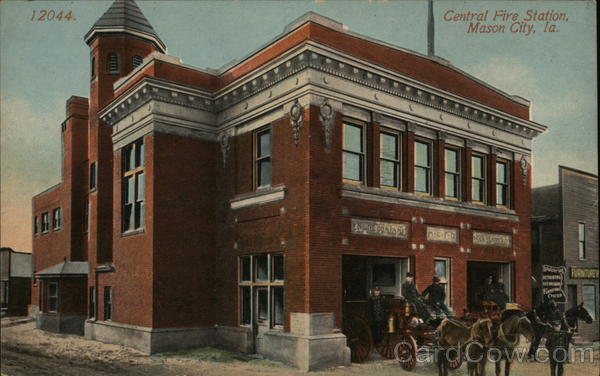 Front: 12044. IRA ENGINE COMPAN Central Fire Station, Mason City, Ia. M-C-F-D HOOK BLADDER Upholstering FURNITURE REPAIRING REFINISHING FURNITURE OPATED Back: Pub. by The Acmegraph Co., Chicago, 254 Post Card STAMPHERE flex