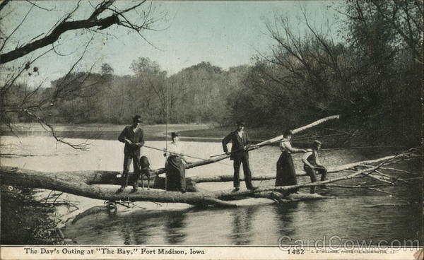 Front: The Day's Outing at "The Bay," Fort Madison, Iowa 1482 C. U. WILLIAMS, PHOTCETTE, BLOOMINGTON, ILL. Back: PHOTORHAel TC. U. WILLIAMS T BLOOMINGTON, PHOTORTBA ILLINOIS E