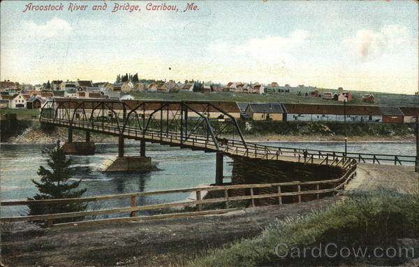 Front: Aroostock River and Bridge, Caribou, Me. 8. Back: No. 7204. We TRADEMARK 150 Post Card & TWO CENTS