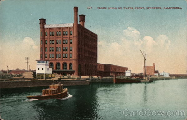 Front: UNION STOCKTON CITY DO po co 100 00 00 00 00 00 81 397 FLOUR MILLS ON WATER FRONT, STOCKTON, CALIFORNIA. 7 Back: MADE IN AMERICA BY EDW H.MITCHELL AT SAN FRANCISCO, CALIFORNIA. THIS SPACE FOR ADDRESS ONLY