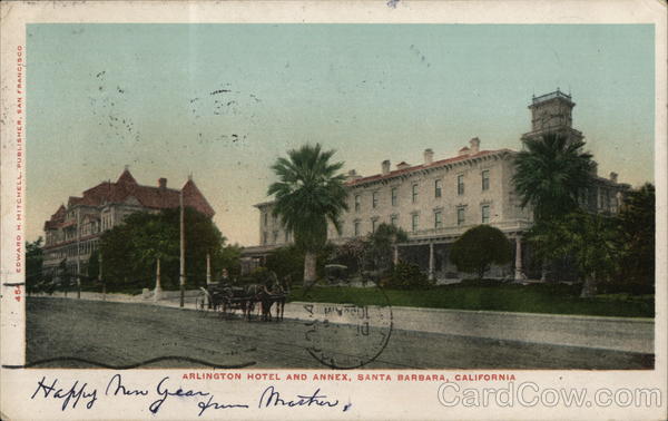 Front: EDWARD H. MITCHELL, PUBLISHER, SAN FRANCISCO 454 ***** FFFFFFF IEEEEE www.sul 19 Happy New Year from Merter, ARLINGTON HOTEL AND ANNEX, SANTA BARBARA, CALIFORNIA h Back: Post Card- Mr Fred K Houston 2217, Scott H San Francisse Calis