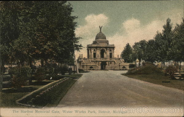 Front: AXT DOO33IHA The Hurlbut Memorial Gate, Water Works Park, Detroit, Michigan Back: H.LT ANA 318 H. L. Woehler, Buffalo, N. Y. & Dresden, Germany. Foreign 2 c. Domestic I c. Postage