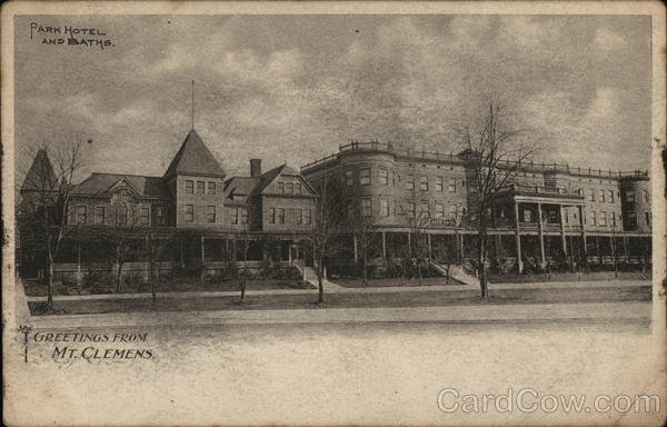 Front: PARK HOTEL AND BATHS. GREETINGS FROM MT. CLEMENS 33 31 3333 PARK HOTEL 333 333' Back: THIS SIDE FOR THE ADDRESS ONLY.