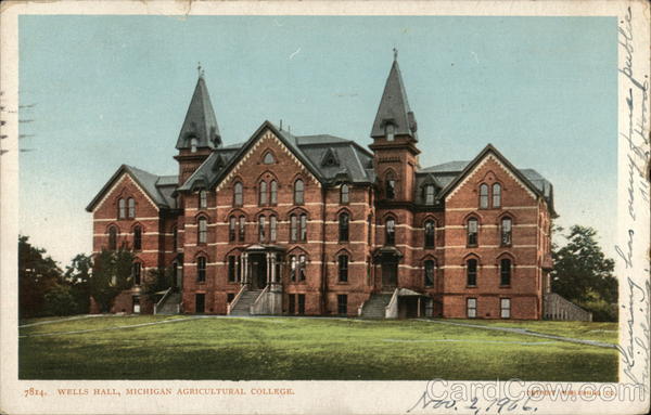 Front: 11 +++ 23 7814. WELLS HALL, MICHIGAN AGRICULTURAL COLLEGE. Nov. 2, 1966. میرا DETROIT PUBLISHING CO. bine Back: POSTS CARD MICH. NOV 2 12 M 06 SERIES 1902 UNITED STATES OF 1:06 FRANKLIN 1790 Mrs. A. E. Kaye Manzaniter Hall Reno Grevada. dite