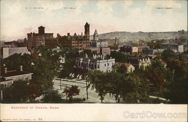 Front: ******* N. Y LIFE BLDG. ND SNAPSHOT OF OMAHA, NEBR. MEGEATH STAT. CO OMAHA, NO. 25 CITY HALL. US Ipar Kana PUBLIC LIBRARY. Tuin Back: Miss na Frarthage па en Tuvin Falls, Idahs