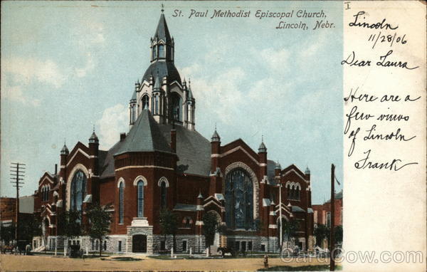 Front: St. Paul Methodist Episcopal Church, Lincoln, Nebr. Linoon 11/28/06 Dear Laura Прече are a fur vinvo of Lincoln Frank Back: 138.7 N Illustrated Postal Card Co. New York Germany. DOMESTIC AND Two CENTS