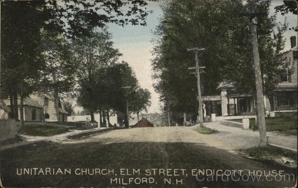 Front: UNITARIAN CHURCH, ELM STREET, ENDICOTT HOUSE MILFORD. N.H. Back: Published by The Boston Store, Milford, N. H. This Space is Exclusively for the Address Two Cents