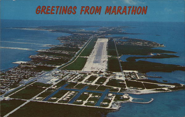 Front: GREETINGS FROM MARATHON Back: AERIAL VIEW OF MARATHON AND AIRPORT DUKANE SCENICS, HOLLYWOOD, FLORIDA 33020 DUKANE PRESS PUKANE OBES FLA. Photo by Ralph Schuurman #2127