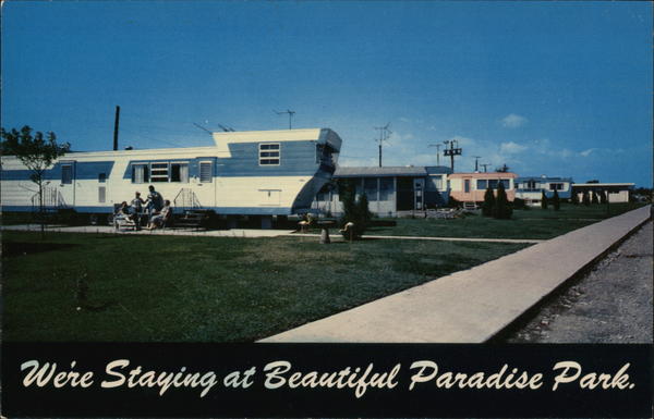 We're staying at beautiful Paradise Park. Most beautiful - spacious mobile home facilities in the Midwest. Located in Chicagoland on US 30 - 4 miles east of Chicago Heights at the junction of the Glenwood Dyer Road. Phone Skyline 5-9324 for reservations or write Paradise Park, Inc., Rt. 1. |