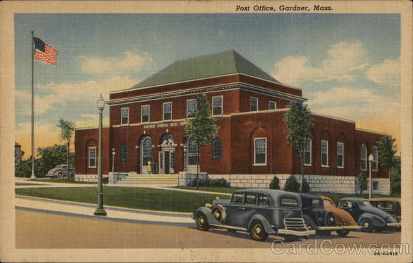 Front: Post Office, Gardner, Mass. HITED TATE OSE 8A-H2412 Back: L. E. DOLHENTY, INC., GARDNER, MASS.