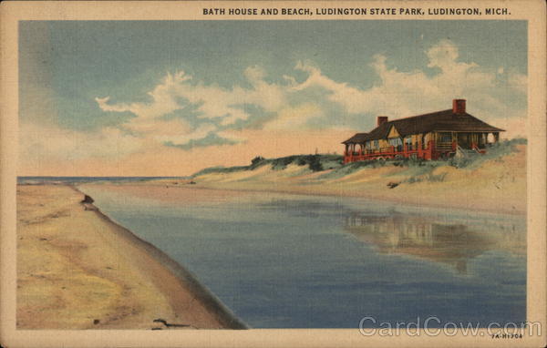 Front: BATH HOUSE AND BEACH, LUDINGTON STATE PARK, LUDINGTON, MICH. 7A-H1704 Back: 'C.T. ART-COLORTONEā REG.U.S.PAT. OFF. MADE ONLY BY CURT TEICH & Co., INC., CHICAGO