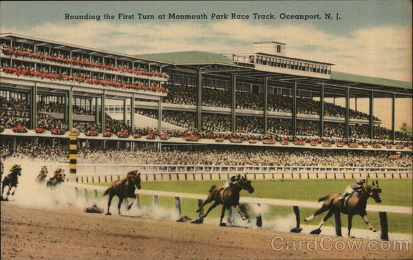 Front: Rounding the First Turn at Monmouth Park Race Track, Oceanport, N. J. Back: "TICHNOR QUALITY VIEWS" REG. U. S. PAT. OFF. MADE ONLY BY TICHNOR BROS., INC., BOSTON, MASS. 78464 STAR STATIONERY CO.. NEWARK, N. J.