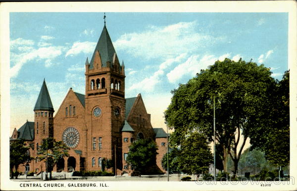 Front: CENTRAL CHURCH, GALESBURG, ILL. 45910 Back: ng BAIRD GALESBURG. ILL. C. T. AMERICAN ART COLORED PUBLISHED BY J. H TEO Wice
