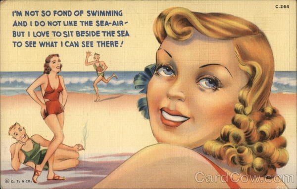 Front: C-264 I'M NOT SO FOND OF SWIMMING AND I DO NOT LIKE THE SEA-AIR- BUT I LOVE TO SIT BESIDE THE SEA TO SEE WHAT I CAN SEE THERE! © c. T. & CO. Back: c. T. MODERN YOUTH COMICS-10 SUBJECTS 7A-H2729