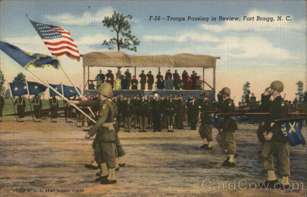 Front: F-56-Troops Passing in Review, Fort Bragg, N. C. PHOTO BY U. S. ARMY SIGNAL CORPS 5B-H83 Back: CAROLINA NEWS CO., FAYETTEVILLE, N. C.