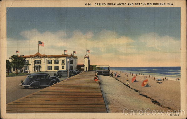 Front: M-14 CASINO INDIALANTIC AND BEACH, MELBOURNE, FLA. EASING 7A-H146 Back: We are 434MOMS 273022 1 CENT 1 1929 from thone bussens But still think of Abe Herber family Durham. Conn. Snow Werdere