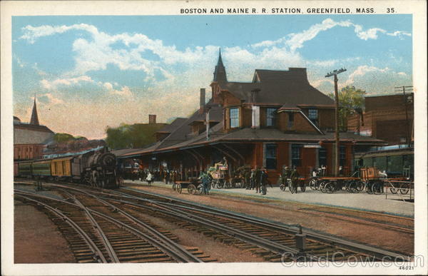 Front: 43 BOSTON AND MAINE R. R. STATION, GREENFIELD, MASS. KO CREENFIELD CO 35. 46021 Back: PUBLISHED BY C. W. HUGHES & CO., INC., MECHANICVILLE, N.Y. STAR QUALITY C. T. AMERICAN ART COLORED TE CHICAS 104 AGO (F HERE