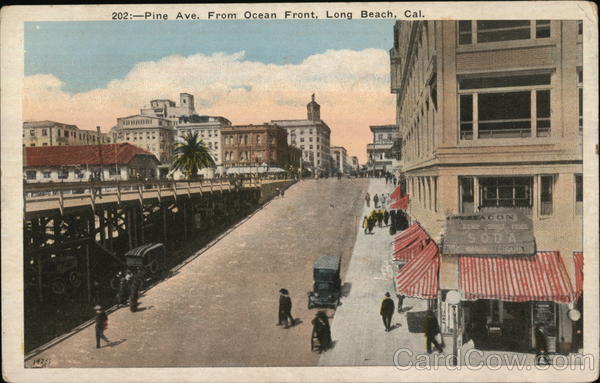 Front: 14251 migh 202: Pine Ave. From Ocean Front, Long Beach, Cal. ET 120 BEACON Back: Pub. by the M. Kashower Co., Los Angeles, Cal. MADEMUSA IN مور STAMP HERE