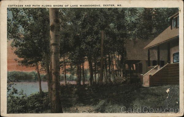 COTTAGES AND PATH ALONG SHORE OF LAKE WASSOOKEAG, DEXTER, ME.