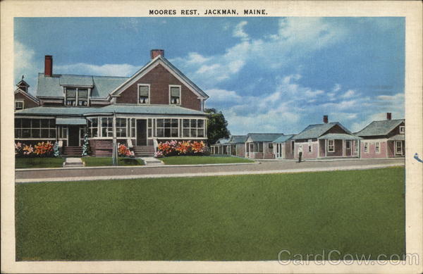 Front: MOORES REST, JACKMAN, MAINE. 18 Back: MF CAMCR CO TUALITY YASS Stopped here Mon lag 23 VIEWS 136236 - /.737