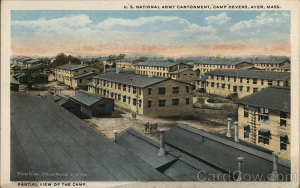 Front: Photo Hesse. Official Photog. U S. Gov. PARTIAL VIEW OF THE CAMP. U.S. NATIONAL ARMY CANTONMENT, CAMP DEVENS, AYER, MASS. #T 111 51 Back: C. T. AMERICAN ART 1178 HICAGO A-75994 THIS SPACE FOR ADDRESS ONLY.