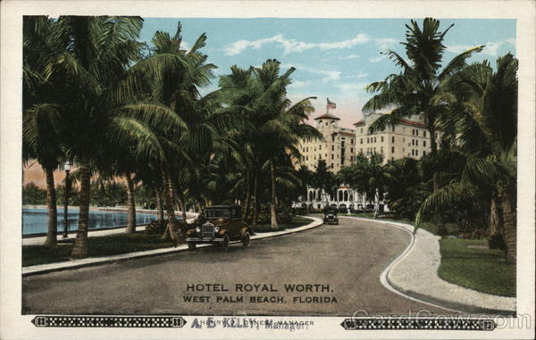Front: HOTEL ROYAL WORTH. WEST PALM BEACH, FLORIDA BA AMERKELBYNEMER Back: 1570 TO ANYWHERE IN U.S. VIA AIRMAIL Co MADE IN U.S.A. BY E. C. KROPP CO., MILWAUKEE
