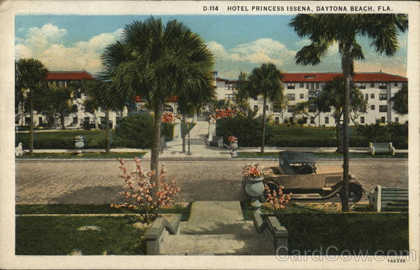 Front: D-114 HOTEL PRINCESS ISSENA, DAYTONA BEACH, FLA. 1A2232 Back: BEAUTIFUL PUBLISHED BY ASHEVILLE POST CARD CO., ASHEVILLE, N.C. FLORIDA C. T. AMERICAN ART COLORED