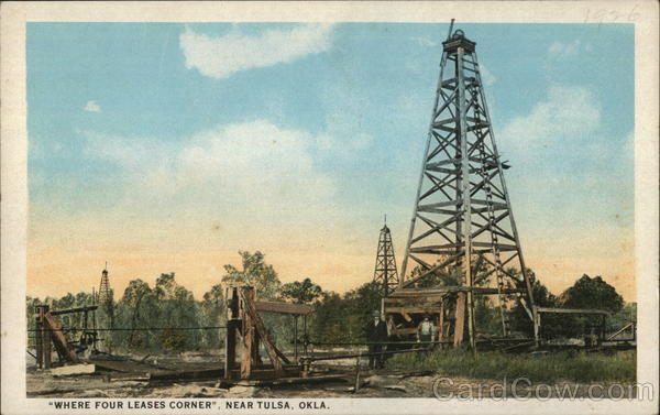 Front: "WHERE FOUR LEASES CORNER", NEAR TULSA, OKLA. 1926 Back: 2- AND ISLAND POSSESSIONS, CUBA, CANADA AND MEXICO A-74219 C. T. AMERICAN ART