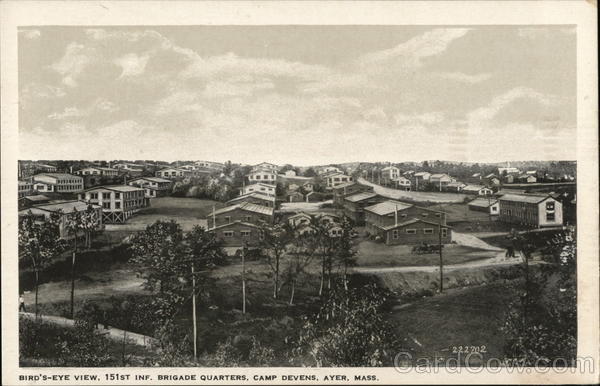 Front: BIRD'S-EYE VIEW, 151ST INF. BRIGADE QUARTERS, CAMP DEVENS, AYER, MASS. 222702 Back: Sackett & Wilhelms Corp., New York and Brooklyn. Printed in U. S. A. SUPERIOR QUALITY FAMOUS THROUGHOUT THE WORLD Address Only