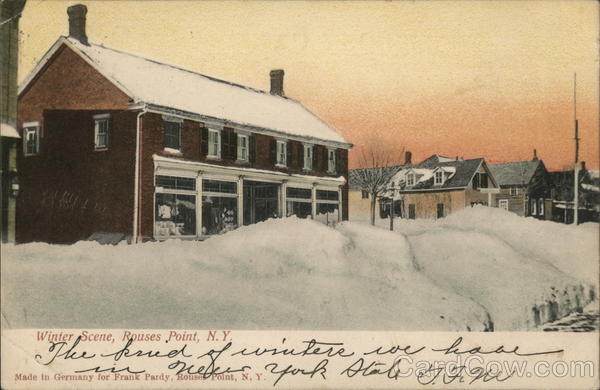Front: 17 سند Winter Scene, Rouses Point, N.Y. The kind on of wintere we have York State J. FIM Made in Germany for Frank Pardy, Rouse Point, N. Y. 1 Back: 27 1958 TOO 1706 FRANKLIN 1790 Miss Mamie Norrie не beutuviile bal ONE CENT