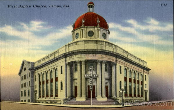 Front: T-82 First Baptist Church, Tampa, Fla. BAPTIST CHURGH BAPTIS CHURCH Back: 82275 "TICHNOR QUALITY VIEWS" REG. U. S. PAT, OFF. MADE ONLY BY TICHNOR BROS., INC., BOSTON, MASS.