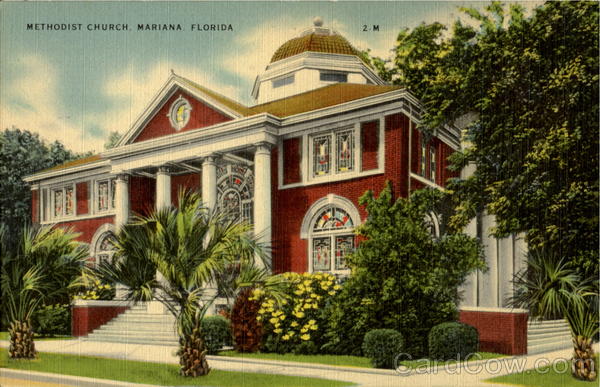 Front: METHODIST CHURCH MARIANA FLORIDA 2-M Back: 50 15,592 DOTHAN, ALA. COLOUR PICTURE PUBLISHED BY THE DOTHAN CIGAR AND CANDY CO. PUBLICATION, CAMBRIDGE, MASS, U. S. A PHOTO BY EDDY'S SUNSHINE STUDIO