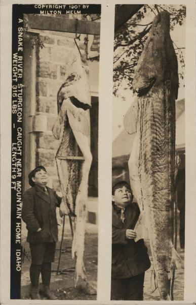Front: COPYRIGHT 1907 BY MILTON HELM A SNAKE RIVER STURGEON WEIGHT 315 LBS CAUGHT NEAR MOUNTAIN HOME IDAHO -LENGTH 9 FT Back: The boy which picture is мовідно in all in this my ho but about twelve and about 150 lbs. 5-