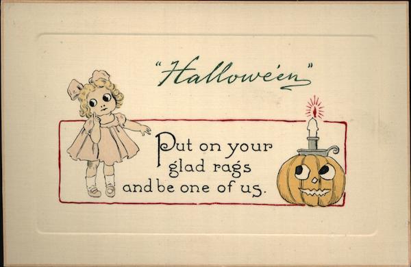 Front: Hallowe'en Jut on your glad rags and be one of us. Pat Back: HANDEMBOSSED H. L.WOEHLER, NEW YORK (Made in Germany. )
